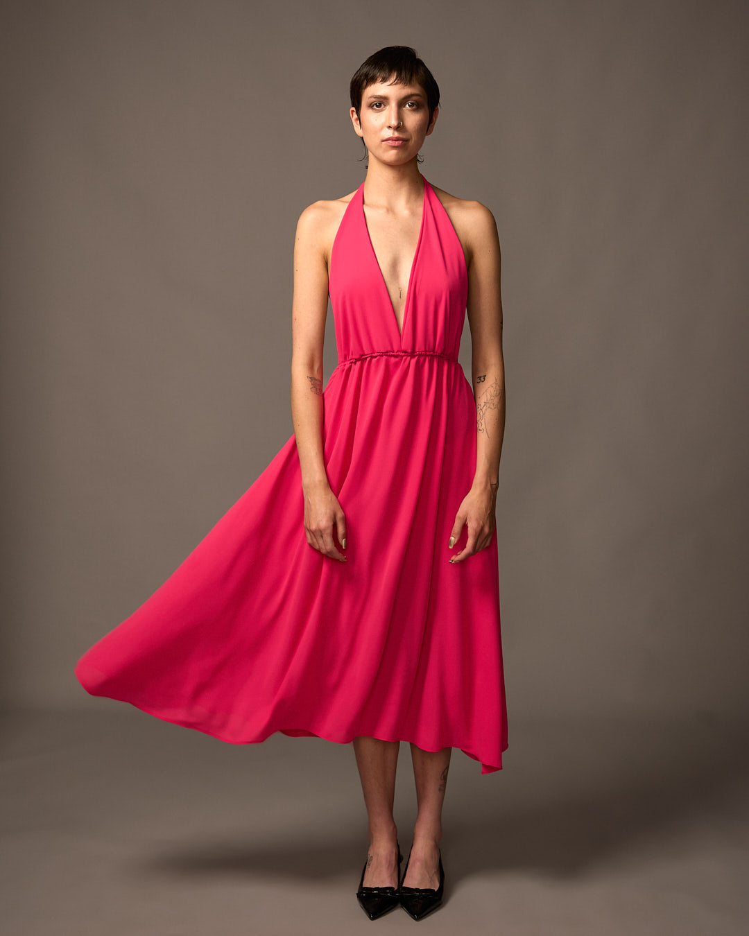 Réalisée dans un tissu de fin de stocks de Haute Couture, la Robe Marilyne Rose Framboise est féminine et gracile avec son décolleté plongeant et sa fluidité aux mouvements aériens.